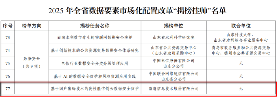 近期,山东省大数据局公布了《2025年全省数据要素市场化配置改革“揭榜挂帅”名单》。腾博会官网信息独立申报的“基于国产密码技术的高性能信创云数据安全防护”项目,凭借在数据安全与要素流通领域的技术创新与实践成果,从众多单位中脱颖而出,成功入选。腾博会官网信息成为揭榜单位中唯一的商密企业。
